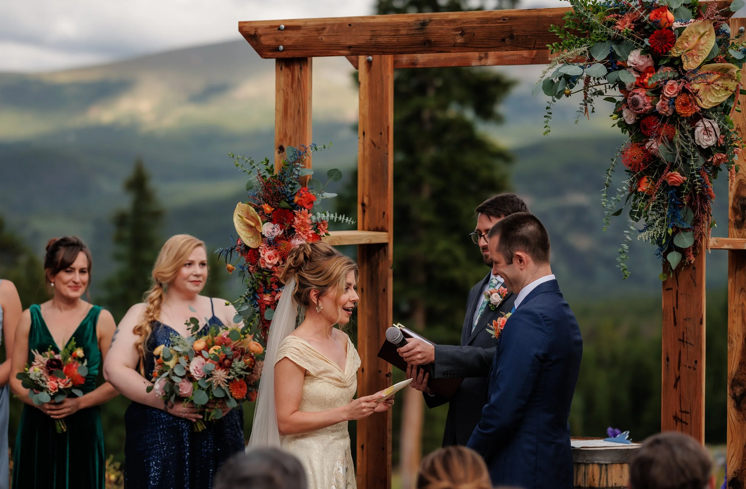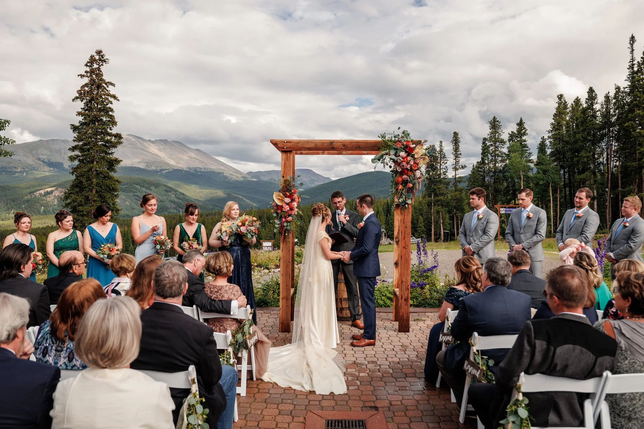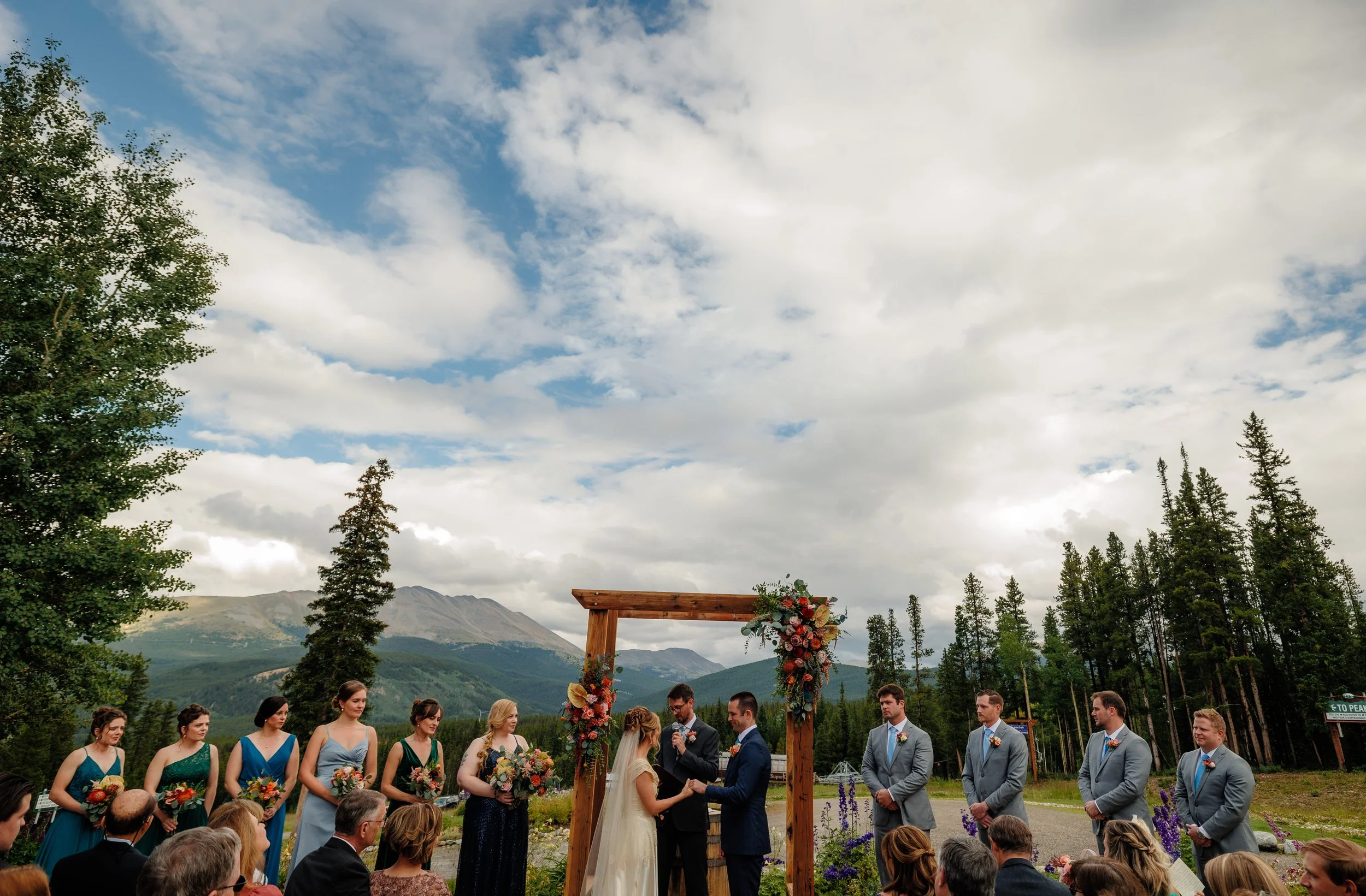 Once the skies cleared, the wedding party lined up for what was about to be an unforgettable ceremony. The backdrop at Ten Mountain Station was absolutely stunning—towering peaks, lush greenery, and a clear blue sky that seemed like it was painted just for them. The ceremony itself was incredibly heartfelt, filled with personal vows and emotional moments that had everyone reaching for tissues.